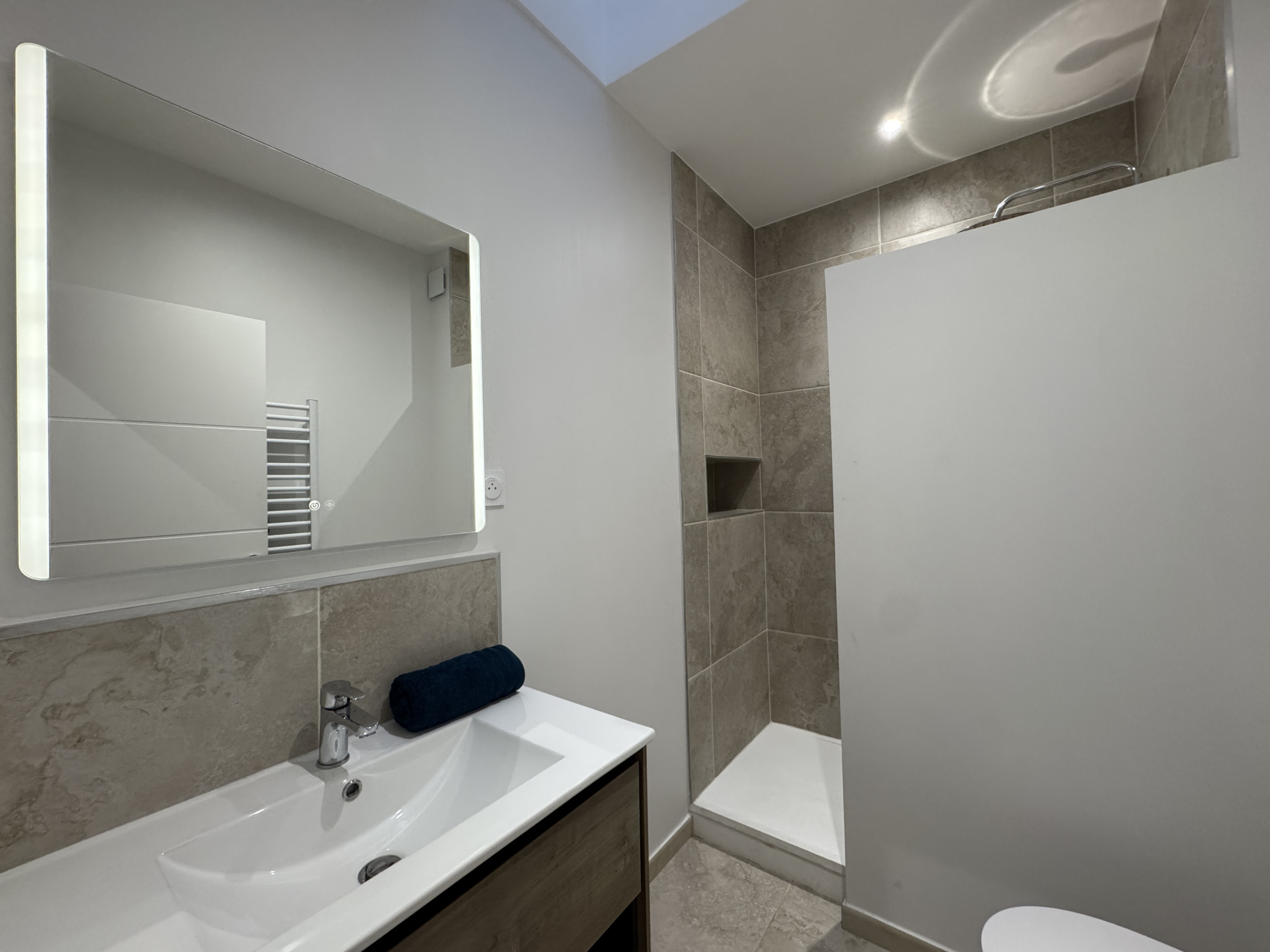 - Un cuarto de baño y un cuarto de ducha modernos
